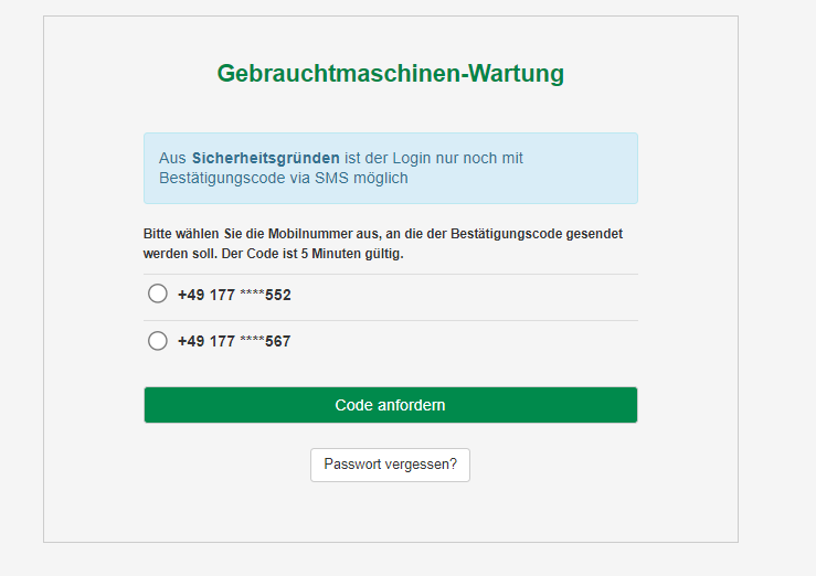 Aus Sicherheitsgründen werden bei der Anmeldung zu Ihrer Maschinenwartung nicht nur Benutzername und Passwort abgefragt, es wird Ihnen zusätzlich auch ein Bestätigungscode via SMS an eine von Ihnen angegebene Handynummer geschickt.